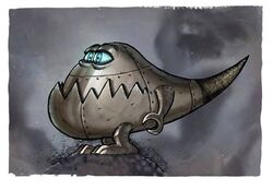 Appearance: A metallic worm-like creature with two stubby arms and legs ending in sharp claws, small glowing eyes, and a massive serrated jaw.