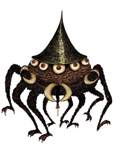 Appearance: An 8 legged, 12 eyed, 8 foot tall spider with several pincher-like mouths, and a witch hat-like horn on top.